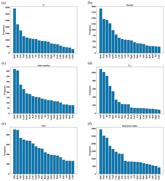 Frequency of occurrence of various compounds for six properties of oxyfluoride glass, (a) glass transition temperature, (b) density, (c) Abbe number, (d) liquidus temperature, (e) thermal expansion coefficient, (f) refractive index.