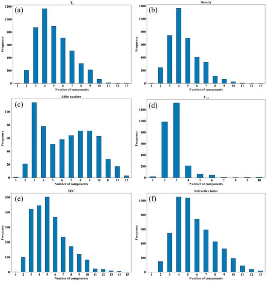 Frequency of the number of glass components for six properties of oxyfluoride glass, (a) glass transition temperature, (b) density, (c) Abbe number, (d) liquidus temperature, (e) thermal expansion coefficient, (f) refractive index.