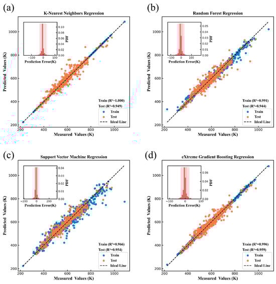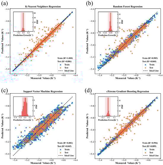 Prediction of thermal expansion coefficient under (a) KNN, (b) RF, (c) SVM, (d) XGBoost.
