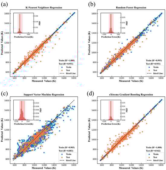 Prediction of liquidus temperature under (a) KNN, (b) RF, (c) SVM, (d) XGBoost.
