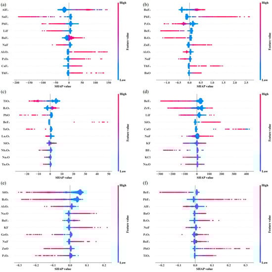 In the field of machine learning, model interpretability is crucial. SHAP, a powerful model interpretation tool whose theory is based on the Shapley value in cooperative game theory, is now widely used in many fields [38,39,40]. In this study, we computed the Shapley value of each glass component with the help of Python’s shap module in order to interpret the six constructed models.