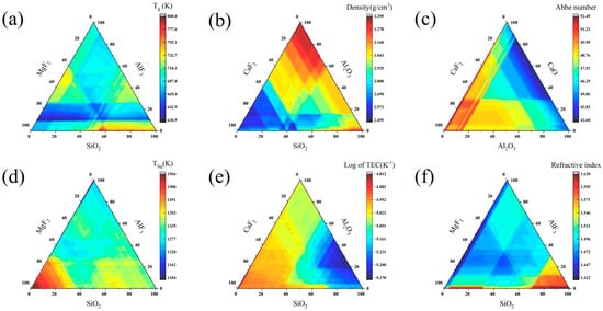 Ternary diagrams for different systems: (a) glass transition temperature of MgF2, AlF3, and SiO2 systems, (b) density of CaF2, Al2O3, and SiO2 systems, (c) Abbe number of CaF2, CaO, and Al2O3 systems, (d) liquidus temperature of MgF2, AlF3, SiO2 systems, (e) thermal expansion coefficient (logarithmic form) of CaF2, Al2O3, SiO2 systems, (f) refractive index of MgF2, AlF3, SiO2 systems.
