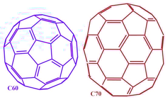 [60]Fullerene or C60 and [70]fullerene or C70. Colours correspond to those of solutions obtained by dissolving each fullerene in a suitable solvent.