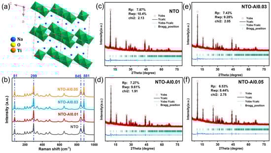 (a) Schematic of the crystal structure of Na2Ti3O7, (b) Raman spectra of the as-synthesized NTO and Al doping samples, (c–f) Rietveld refinement of NTO, NTO-Al0.01, NTO-Al0.03, and NTO-Al0.05.