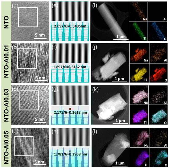 To further investigate the microstructure of the samples, Figure 2 presents TEM images of NTO and NTO-Alx particles. All samples exhibit rod-like particle structures with well-defined crystalline regions (Figure 2i–l). The HRTEM images (Figure 2a–d) reveal distinct lattice fringes, while the corresponding inverse fast Fourier transform (IFFT) images and line profiles (Figure 2e–h) provide accurate measurements of the d-spacings. For undoped NTO, the IFFT image shows an interplanar spacing of 0.3495 nm, matching the (110) plane of Na2Ti3O7 as calculated by Bragg’s law (2dsin θ = nλ) [36]. Similarly, the NTO-Al0.01 sample exhibits an average fringe spacing of 0.3162 nm, corresponding to the (111) plane of Na2Ti3O7, while the NTO-Al0.03 sample displays a spacing of 0.3618 nm, consistent with the (102) plane [37]. The NTO-Al0.05 sample shows a spacing of 0.2968 nm, aligning with the (003) plane [38]. Notably, the HRTEM images did not capture the (100) plane, which corresponds to the strongest XRD peak, due to the random orientation of the small regions analyzed in TEM and the challenges in resolving larger d-spacings in IFFT patterns, where reciprocal lattice points are more densely packed and harder to distinguish. Consequently, TEM analysis could not provide consistent comparisons of specific crystallographic planes across different doped samples. Finally, EDX mapping confirms the uniform distribution of Na, Ti, and O in all samples, along with homogeneous Al dispersion in the doped samples, indicating successful incorporation of Al into the Na2Ti3O7 crystal structure, in agreement with the XRD results.