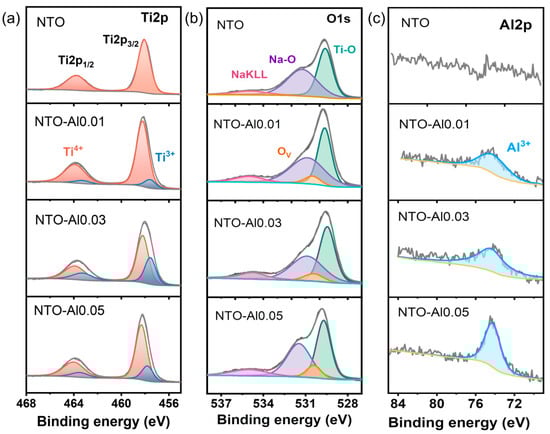 XPS spectra taken from the NTO-Alx (x = 0, 0.01, 0.03, and 0.05) samples of (a) Ti 2p spectra, (b) O 1s spectra, and (c) Al 2p spectra.