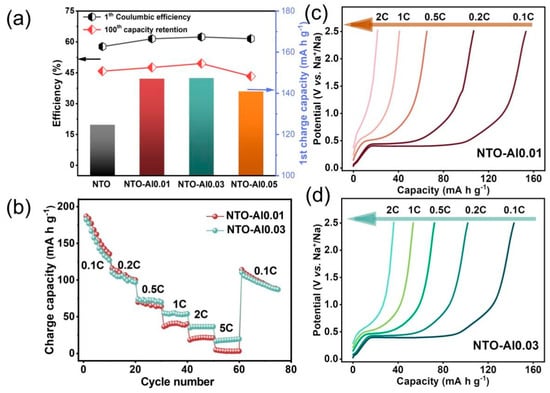 (a) Comparison chart of ICE, capacity retention rate, and first charge capacity; (b) rate performance of the NTO-Al0.01 and NTO-Al0.03 samples; the charge curves of (c) NTO-Al0.01 and (d) NTO-Al0.03.