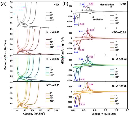 (a) Charge/discharge curves and (b) corresponding dQ/dV curves of NTO-Alx (x = 0, 0.01, 0.03, 0.05) samples at 88.5 mA g−1 current during 100 cycles.