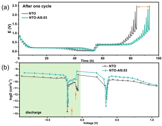 Figure 6a presents the potential response of electrodes during GITT measurements after one cycle at 0.2C. The potential variation during each relaxation period reflects the overpotential at different sodiation/desodiation stages. Notably, NTO-Al0.03 exhibits smaller overpotentials than pristine NTO at the same voltage, particularly in higher voltage ranges, indicating superior kinetic properties. The calculated Na⁺ diffusion coefficients (DNa) are shown in Figure 6b. Both electrodes initially show decreasing DNa values during sodiation (above the plateau voltage), corresponding to the sloping region of discharge curves. As sodiation progresses, the material transitions from single-phase to two-phase coexistence, leading to varied diffusion behaviors. The sharp DNa drop at plateau voltages occurs because Na+ must overcome repulsive charge gradients from pre-inserted ions for further diffusion. During desodiation, DNa generally decreases with reduced Na content, except at the desodiation plateau.