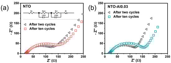 The Nyquist plots of (a) the NTO cells and (b) the NTO-Al0.03 cells after two cycles and ten cycles; inset figure is the equivalent circuit.