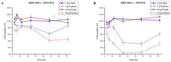Growth curves show that in the absence of photoactivation (solid lines in Figure 1), both BTZ-PTZ concentrations used (1 and 10 µM) did not induce significant cytotoxic effects on hBM-MSCs, with cell viability values in the presence of both compounds around 100% relative to untreated control cells up to 72 h. Conversely, in the case of hASCs, a reduction in cell viability was recorded, with minimum values of about 70% and 50%, reached 48 h after the treatment with 10 µM of BTZ-PTZ and NPI-PTZ, respectively. On the other hand, photoexposure resulted in a significant reduction in cell viability, with an effect strictly dependent on the dose, time, and compound used. For BTZ-PTZ, hBM-MSCs (Figure 1A) treated with 10 µM (red dashed line) showed a reduction in cell viability below 80% after 3 h, reaching a minimum of approximately 40% at 48 h, while a lower concentration (1 µM, blue dashed line) induced a similar trend with slightly higher live cell percentages. NPI-PTZ showed similar trends but higher phototoxicity: in hBM-MSCs (Figure 1B), a concentration of 1 µM (blue dashed line) reduced cell viability to below 40% within 24 h, though it ultimately increased again after a longer time period, while 10 µM (red dashed line) caused a decrease in cell viability below 10% during the first 24 h, with a final enhancement at 72 h. This behavior might be rationalized by considering that surviving cells could increase their population over a long timeframe, contributing to the ultimate growth of the curve. hASCs showed greater sensitivity to the same treatments. In the case of BTZ-PTZ (Figure 1C), cell viability dropped below 50% after 3 h and further reduced to 15% at 72 h when used at 10 µM (red dashed line), while an initial drop around 55% decreasing below 50% at 72 h was measured with a 1 µM concentration (blue dashed line). To understand this complex behavior, the slight effect of dark cytotoxicity, adding to immediate phototoxicity, has to be considered in the long run. In particular, the further reduction detected at the longest incubation times could be related to the modest dark toxicity brought about by BTZ-PTZ. Finally, the treatment of hASCs with both concentrations of NPI-PTZ (Figure 1D) was responsible for the almost complete disappearance of the cell population, as revealed at the first data collection point, i.e., 3 h; then, cell viability remained almost zero at the highest concentration (red dashed line), while it grew back to about 30% after 24 h and decreased again after a longer time period with 1 µM (blue dashed line). In this latter case, after most cells were promptly suppressed, the surviving ones could start to undergo reproduction, thus increasing their number, which would eventually be reduced again because of the small, albeit non-negligible, dark toxicity exerted by NPI-PTZ as the incubation time increased.