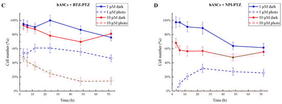 Stem cell viability of hBM-MSCs (upper panels, (A,B)) and hASCs (lower panels, (C,D)) assessed at 3, 6, 12, 24, 48, and 72 h of incubation with BTZ-PTZ and NPI-PTZ used at two distinct concentrations (1 and 10 µM in blue and red, respectively). Cells were either kept in the dark (dark, solid line) or photoexposed for 25 min in the LED chamber (λexc = 390–400 nm and a power of 1.7 mW/cm2) (photo, dashed line). Values are reported as the mean of three independent experiments ± SD; 100% corresponds to control mean values.