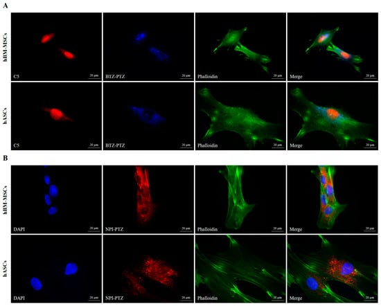 Representative fluorescence microscopy images of fixed hBM-MSCs (upper panels) and hASCs (lower panels). (A) Cells stained with 10 μM BTZ-PTZ (blue, DAPI filter) and the nuclei marker C5 (red, TRITC filter), along with relative phalloidin (green, FITC filter) and merged images (image magnification: 60×). (B) Cells stained with 10 μM NPI-PTZ (red, TRITC filter) and the nuclei marker DAPI (blue, DAPI filter), along with relative phalloidin (green, FITC filter) and merged images (image magnification: 60×).