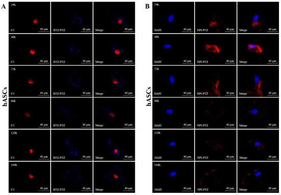 Figure 4 and Figure S3 show the intracellular fluorescence stability of the compounds BTZ-PTZ and NPI-PTZ in hBM-MSCs and hASCs, respectively, evaluated through fluorescence microscopy over 6 days (144 h) and quantified by plotting the LogCTCF as a function of time. In hBM-MSCs (Figure S3), both compounds exhibited a rather stable intracellular fluorescence. Following internalization, BTZ-PTZ and NPI-PTZ maintained high and homogeneous fluorescence intensity throughout the observation period, with a significant attenuation only revealed by the end of the monitoring, as revealed by the histograms showing fluorescence intensities, expressed as LogCTCF, as a function of time (Figure S3C,D).