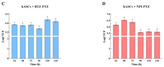 Intracellular fluorescence of BTZ-PTZ and NPI-PTZ in hASCs over time. Representative fluorescence microscopy images of cells showing the fluorescence signal of 10 µM BTZ-PTZ (A) and NPI-PTZ (B) at different time points (24, 48, 72, 96, 120, and 144 h) after internalization (image magnification: 60×). Histograms represent the fluorescence intensity of BTZ-PTZ (C) and NPI-PTZ (D), expressed as LogCTCF, as a function of time. Data are presented as mean ± SD (n = 5). Columns labeled with different letters are significantly different at p < 0.05.