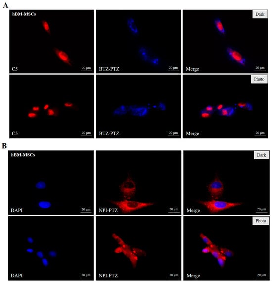 Representative fluorescence microscopy images of 10 µM BTZ-PTZ (A) and NPI-PTZ (B) with hBM-MSCs in dark conditions (upper panels) and after 25′ of photoexposure in an LED chamber; (λexc = 390–400 nm and a power of 1.7 mW/cm2) (lower panels). Image magnification: 60×.