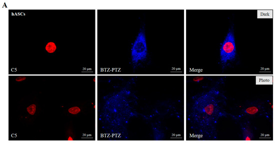 The MTT assay was used to assess the dark cytotoxic effect 72 and 96 h after the treatment with the two compounds at a concentration ranging from 0.01 to 10 µM. The complete data from the MTT assay are reported in the Supporting Information (Figures S1 and S2). Neither BTZ-PTZ nor NPI-PTZ showed a significant effect on the viability of hBM-MSCs after 72 and 96 h of incubation in the dark (Figure S1A,B), with cell viability remaining above 90% even at high concentrations (10 µM). Conversely, in hASCs (Figure S1C,D), the highest concentration of BTZ-PTZ reduced cell viability in a time-dependent manner, reaching levels around 85% after 72 h and just below 70% after 96 h.