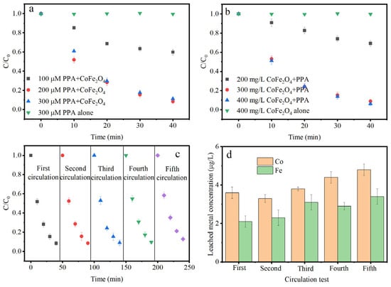 Effect of PAA dosage (a), effect of CoFe2O4 dosage (b), multiple oxidation efficiency (c), and metal leaching in CoFe2O4/PAA (d). Conditions: (a) [IPM] = 2 μM, [PAA] = 100–300 μM, CoFe2O4 dosage = 300 mg/L, and pH = 7.0; (b) [IPM] = 2 μM, [PAA] = 200 μM, CoFe2O4 dosage = 100–400 mg/L, and pH = 7.0; and (c,d) [PAA] = 200 μM, dosage of CoFe2O4 = 300 mg/L, [IPM] = 2 μM and pH = 7.0.