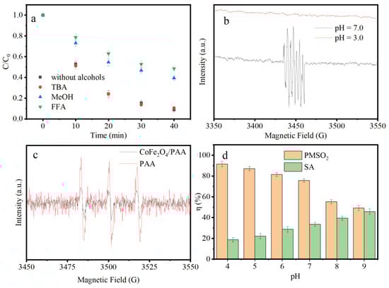 Effect of various quenching agents on IPM degradation of CoFe2O4/PAA (a), in situ ESR spectra of CoFe2O4/PAA (b,c), and conversion percentage (η) of PMSO2 and SA (d). Conditions: pH = 7 in (a,c,d), [PAA] = 200 μM, dosage of CoFe2O4 = 300 mg/L, [IPM] = 2 μM in (a), [TBA] = [MeOH] = [FFA] = 5 mM, [DMPO] = [TEMPO] = 50 mM, [PMSO] = [BA] = 10 μM.