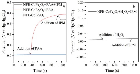 Open-circuit potential curves of the NFE-CoFe2O4 electrode. (a) NFE-CoFe2O4 electrode with added PAA; and (b) NFE-CoFe2O4 electrode with added H2O2. Conditions: [PAA] = 200 μM, [H2O2] = 276 μM, [IPM] = 2 μM, and pH = 7.0.