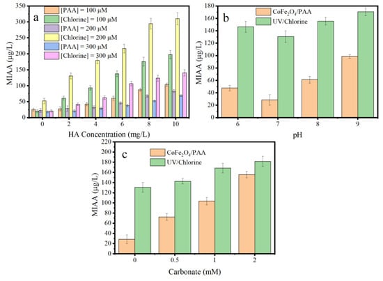Effect of the oxidant dosage and HA concentration (a), pH values (b), and carbonate concentration (c) for the MIAA formation potential in the CoFe2O4/PAA and UV/chlorine. Conditions: the dosage of CoFe2O4 = 300 mg/L, the average fluency rate of UV254 = 1.54 mW/cm2, and pH = 7.0 in (a); [PAA] = [chlorine] = 200 μM, the dosage of CoFe2O4 = 300 mg/L, and [HA] = 2 mg/L in (b); [PAA] = [chlorine] = 200 μM, the dosage of CoFe2O4 = 300 mg/L, [HA] = 2 mg/L and pH = 7.0 in (c); and the reaction time for the CoFe2O4/PAA and the UV/chlorine was 40 min and 10 min, respectively.