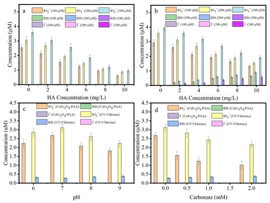 Effect of the oxidant dosage and HA concentration on the inorganic iodine species distribution in the CoFe2O4/PAA (a), and the UV/chlorine (b); effect of the pH values (c) and carbonate concentration (d) on the inorganic iodine species distribution in the CoFe2O4/PAA and the UV/PAA. Conditions: the dosage of CoFe2O4 = 300 mg/L, pH = 7.0 in (a); the average fluency rate of UV254 = 1.54 mW/cm2, pH = 7.0 in (b); [PAA] = [chlorine] = 200 μM, the dosage of CoFe2O4 = 300 mg/L, the average fluency rate of UV254 = 1.54 mW/cm2, and [HA] = 2 mg/L in (c,d), pH = 7.0 in (d); and the reaction time for the CoFe2O4/PAA and the UV/Chlorine was 40 min and 10 min, respectively.
