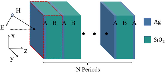 Firstly, we consider a conventional metal–dielectric photonic crystal and analyze its PBE and nonlinear properties. The conventional PCs (AB)NA were composed of metal A and dielectric materials B, as shown in Figure 1. A, B, and N represent the nonlinear optical material (Ag), SiO2, and periodic number, respectively. The linear dielectric constant of Ag in the HMM was obtained using the Drude model [12,38]: