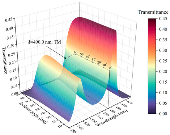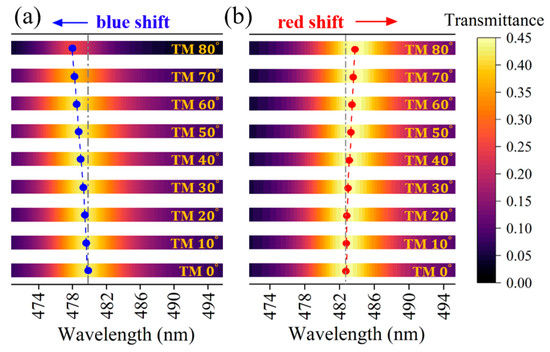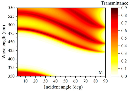 where represents the dielectric-layer filling ratio. We set , select to be 344.8 nm, and finally obtain the thicknesses of the HMM and dielectric layers as and , so this PC is angle-insensitive under linear conditions. The period number of HMM multilayer films is selected to be M = 16, and the period number of PCs is N = 6, so the PCs containing HMM are denoted by [(CD)16B]6, where and .