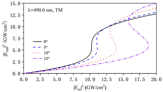 Moreover, we investigated the relationship between the nonlinear optical effects and the incident angle of the TM wave near the upper band edge of the PCs by following the nonlinear transfer matrix method [37]. As shown in Figure 3, we chose an incident wavelength of 490.0 nm and simulated the optical nonlinear transmission characteristics of truncated PCs (AB)NA under TM polarization at incident angles of 0°, 5°, 10°, and 15°. It is found that the critical threshold intensity of the optical bistability becomes larger rapidly with the increase in the incident angle. The localized electronic field at the band edge wavelength is higher than that away from band edge in the PCs, which results in enhanced nonlinear optical effects so that the critical threshold intensity is the lowest at normal incidence. Though the PBEs of PCs are affected by the light intensity, the band edge wavelength at the normal incidence still gradually moves away from the band edge of oblique incidence as the incident angle increases, which induces a lower localized electronic field within the PCs. As a result, the critical threshold intensity of optical bistability near the long-wavelength band edge gradually increases. Therefore, the angle-sensitive band edge is an important factor in angle-sensitive nonlinear optical effects.