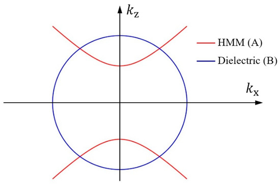 In recent years, many studies have shown that when HMM is introduced in PCs, such micro/nanostructures exhibit an angle-insensitive PBE based on phase-variation compensation [30,33]. We construct new PCs containing nonlinear HMM, which are denoted as (AB)N, wherein A, B, and N represent the HMM, the dielectric material, and the periodic number, respectively. The dielectric material is selected to be TiO2 and its refractive index is 2.33 [12]. The iso-frequency curves of layers A and B are shown in Figure 4, where the special wavevector dispersion of HMMs provides a new method to engineer the PBE. According to the phase-variation compensation [30], the conditions to achieve an angle-insensitive PBG using PCs containing HMM can be evolved as follows: