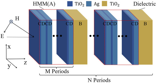 Firstly, we use a zero-shifted PBE under linear conditions to illustrate type (I). A structure based on phase-variation compensation is designed and its nonlinear transmission characteristics are analyzed, where the HMM (A) is composed of subwavelength metal–dielectric periodic multilayer films (CD)M, wherein C, D, and M denote TiO2, the noble metal Ag (exhibiting a large optical nonlinear coefficient), and periodic number, respectively. Therefore, the new PCs are denoted as [(CD)MB]N, as shown in Figure 5. An angle-independent PBE under linear conditions can be observed when the phase variation is compensated based on Equation (9). Firstly, we determine the geometric parameters of the HMM; according to the effective medium theory (EMT), the effective medium permittivity tensor in two directions can be written as [29] follows:
