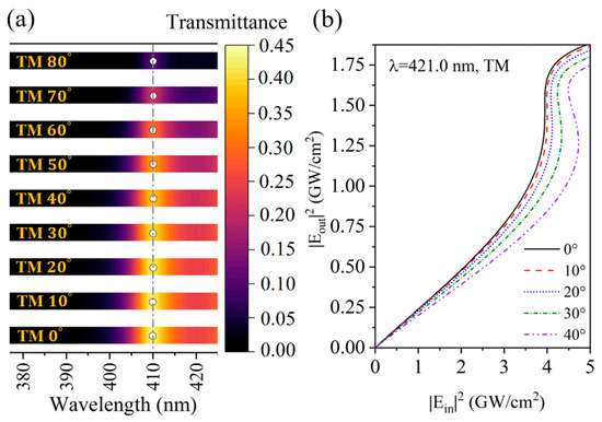 We simulated the transmission spectrum of the structure under linear conditions and its nonlinear transmission characteristics, as shown in Figure 6a,b. It can be found that the PC has a zero-shifted PBE under linear conditions but it has angle-sensitive optical bistability since the phase-variation compensation condition is changed by the light intensity. As the angle increases, the red-shifted PBE causes the fixed incident wavelength to enter the bandgap, which results in an increase in the critical threshold intensity. Therefore, regarding the angle-sensitive nonlinear transmission characteristics of the PBE, whether it is blue-shifted into the passband or red-shifted into the bandgap, the critical threshold intensity is always enhanced with the increase in the incident angle.