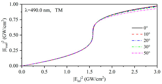 Considering the independent effect of the incident angle and local field strength, we simulated the transmission spectra of the PCs (AB)3 containing HMM at different incident angles under linear conditions, which is shown in Figure 7a, as well as the transmission spectra with different local field strengths under nonlinear conditions, as given in Figure 7b. It can be found that the transmission characteristic of the structure is angle-sensitive under linear conditions. However, when the nonlinear condition is considered, the transmission spectrum of PCs (AB)3 containing a nonlinear HMM at an incident electric field strength of 1.5 GW/cm2 is shown in Figure 8. It can be found that an angle-independent PBE emerges when the influences of the incidence angle and the local field strength are considered simultaneously, and the angle-independent transmittance is realized by the PCs at wavelengths of 490.0 nm from 0° to 50°. The change in angle sensitivity arises from the red-shift of the PBE due to the change in the local field strength as the angle increases, which gives the nonlinear response of the PCs [(CD)4B]3. The output electric field intensity for the PCs was calculated as a function of the incident electric intensity , as shown in Figure 9. The optical bistable critical wavelength of this structure is 490.0 nm, at which the nonlinear transmission curve of the structure almost completely overlaps from 0° to 50°. The optical bistable threshold intensity remains about 1.5 GW/cm2, indicating that PCs containing HMM are angle-insensitive in terms of nonlinear effects. Such PCs containing HMM can be engineered to develop novel angle-insensitive nonlinear optical devices.