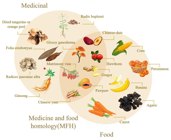 With the development of society, the production concept of green chemistry has become deeply rooted in people’s hearts, and taking “green” biomass as a raw material has gradually become a hot spot in production research. Especially in the synthesis of precursors, a large number of green precursors can be used as natural carbon sources for the synthesis of CDs, which has obvious advantages such as rich and renewable raw materials, no chemical pollution, and environmental friendliness [14]. Various green carbon precursors have been studied and applied, including fruits, vegetables, and various foods and beverages [15], in order to realize the synthesis of materials with good material characteristics, high cost efficiency and economic and environmental protection. Among these green precursors, the homology of medicine and food (MFH) [16] has attracted wide attention because of its unique medicinal value. MFH refers to many foods, that is, medicines. In traditional medicine, some substances can be used as part of a daily diet to maintain the normal physiological functions of the human body, and they can also play a role in certain medical treatments of specific diseases, which embodies the wisdom concept of China’s traditional health care and disease prevention. Medicinal food varieties developed according to MFH theory have the function of preventing and treating chronic diseases and protecting health. Figure 1 shows the development history of CDS and MFH-CDs. By 2024, the National Health Commission has published more than 110 kinds of MFH Chinese herbal medicines, such as Lycium barbarum, Chinese yam, hawthorn, etc. [17]. Figure 2 shows the homologous relationship between Chinese herbal medicines and foods. After long-term practice, these substances have been confirmed to have good safety and certain health care and medicinal values.