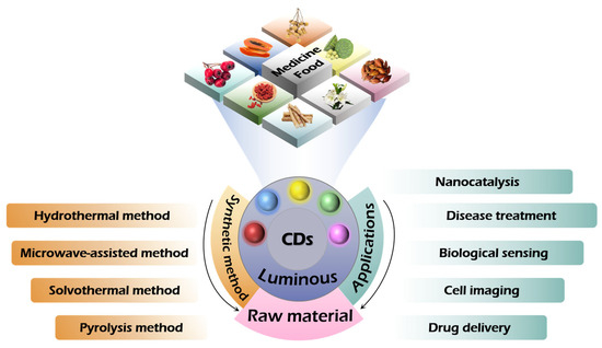 However, it was not until 2006 that Sun et al. [10] formally defined “carbon dots” (CDs) as spherical and monodisperse nanoparticles with a particle size less than 10 nm, and carbon dots refer to new nanomaterials discovered after carbon nanotubes, fullerenes, and graphene [11,12,13]. Since then, there have been sporadic reports on the nature of CDs, but the basic knowledge about CDs is still elusive. Researchers mainly focus on the refined improvement of preparation methods and the diversified expansion of application scenarios. In the search for synthetic raw materials, researchers have invested a lot of energy in chemical substances and various natural substances. However, the research on synthesizing carbon dots with medicinal and edible homologous substances as carbon sources and exploring their applications is relatively scarce.