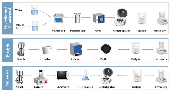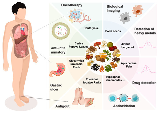 In addition to the above common methods, there are some methods that are not often used to prepare carbon dots in traditional Chinese medicine. For example, Gudimella et al. [69] grind papaya leaves and dilute them with water and then filter them with Whitman filter paper (nano-pore size). The filtrate was placed on a sand bath and then stirred at 180 °C for 24 h to obtain blue fluorescent CDs, which have good free radical scavenging activity, antioxidant activity, and anti-inflammatory activity in vitro.