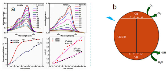 (a) Photocatalytic degradation of coconut shell carbon dots, (b) photocatalytic mechanism of neem leaf carbon dots (CD)-modified cadmium sulfide (CdS) nanomaterials.
