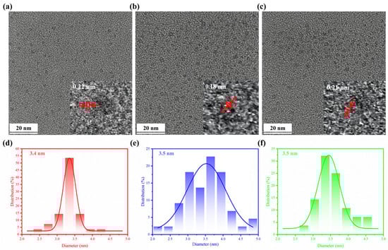 The TEM images revealed that tBuCz-CDs, HAH-CDs, and EC-CDs all exhibited nano-layered structures (Figure 1). A statistical analysis of the particle size distribution indicated average diameters of 3.4 nm, 3.5 nm, and 3.5 nm, respectively, with good dispersibility. The high-resolution TEM images shown in the insets further confirmed their nanostructures. The lattice fringe spacings of tBuCz-CDs, HAH-CDs, and EC-CDs were 0.22 nm, 0.18 nm, and 0.21 nm, respectively, corresponding to the (111) plane of graphene, the (102) plane of a graphene variant, and the (100) plane of graphite carbon [9,22,23].
