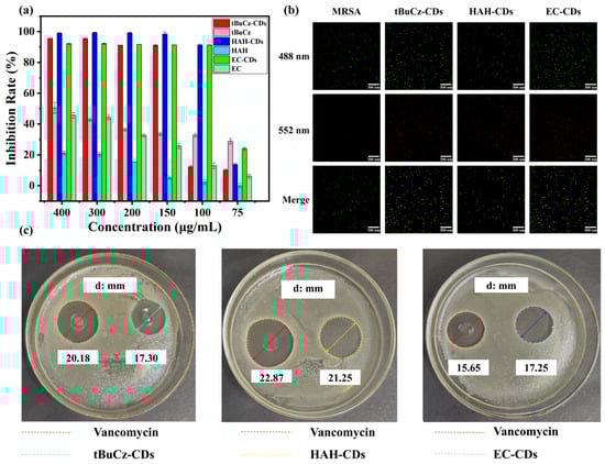To further investigate the antibacterial activity of tBuCz-CDs, HAH-CDs, and EC-CDs, we conducted antibacterial performance experiments. First, we explored the antibacterial effects of different doses of CDs on various bacteria. As shown in Figure 3a,b, after incubating the CDs with bacteria at 37 °C for 18 h, tBuCz-CDs, HAH-CDs, and EC-CDs exhibited MIC values of 100, 100, and 150 µg/mL, respectively, which are significantly higher than those of the raw materials tBuCz, HAH, and EC. The minimum bactericidal concentration (MBC) values of 150, 200, and 100 µg/mL, against MRSA (Figure S3). The observation that the MBC of EC-CDs is lower than their MIC may be attributed to their unique mechanism of action, which enables them to directly kill bacteria at lower concentrations rather than merely inhibiting their growth [25]. These results demonstrated that tBuCz-CDs, HAH-CDs, and EC-CDs exhibited strong antibacterial properties. The ZOI assay further validated their effectiveness, with ZOI diameters for tBuCz-CDs, HAH-CDs, and EC-CDs at the same concentrations comparable to those of the traditional antibiotic vancomycin hydrochloride against MRSA (Figure 3c). Meanwhile, live/dead bacterial staining with DMAO/PI demonstrated that CDs at 500 µg/mL caused severe damage to MRSA after incubation at 37 °C for 1 h, thereby inducing bacterial death (Figure 3b). These findings highlighted the potential of CDs as effective antibacterial agents.
