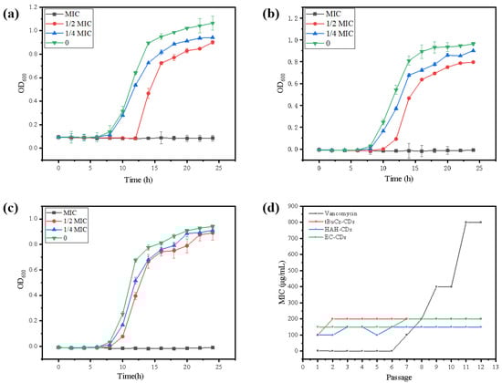 The bacterial growth inhibition curves demonstrated that bacterial growth was completely inhibited at the MIC. When the concentration of CDs was below the MIC (1/2 MIC, 1/4 MIC), bacterial growth was partially inhibited but eventually returned to normal (Figure 4a–c). The emergence of resistance is a significant concern for the effectiveness of antibiotics. Therefore, to assess whether CDs could induce resistance in MRSA, we conducted a continuous passage experiment using CDs at 1/2 MIC for 12 generations. As shown in Figure 4d, after 12 generations of treatment with tBuCz-CDs, HAH-CDs, and EC-CDs, the MICs of MRSA did not change significantly (from 100 µg/mL to 200 µg/mL for tBuCz-CDs and HAH-CDs, and from 150 µg/mL to 200 µg/mL for EC-CDs), indicating that the CDs did not induce significant resistance in MRSA.