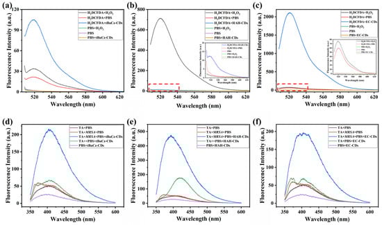 Generation of total ROS by CDs and detection of •OH using terephthalic acid (TA). (a) Generation of ROS by tBuCz-CDs, as evidenced by the oxidation of DCFH-DA. (b) Generation of ROS by HAH-CDs, as evidenced by the oxidation of DCFH-DA. (c) Generation of ROS by EC-CDs, as evidenced by the oxidation of DCFH-DA. (d) Fluorescence intensity changes due to the reaction of •OH generated by tBuCz-CDs with TA. (e) Fluorescence intensity changes due to the reaction of •OH generated by HAH-CDs with TA. (f) Fluorescence intensity changes due to the reaction of •OH generated by EC-CDs with TA.