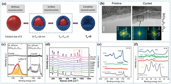 (a) Schematic representation of the structural evolution and varying degrees of surface reconstruction in spherical pre-catalysts and their derived reconstructed forms. D indicates the pre-catalyst diameter, while Tlsr, Thsr, and Tcr correspond to the thicknesses of catalysts exhibiting low, high, and full surface reconstruction, respectively [5]. (b) HRTEM images depict SrCo0.9Ir0.1O3−δ before and after undergoing five electrochemical cycles (scale bar: 5 nm) [12]. (c) XPS analysis of Sr 3d and Co 2p core levels in SrCo0.9Ir0.1O3−δ before and after electrochemical evaluation [12]. (d) Pseudo-in situ Raman spectra acquired during the HER [13]. (e) Co 2p XPS spectra of Co0.5W0.5Sx following HER in 1 M KOH, 1 M PBS, and 0.5 M H2SO4 electrolytes [14]. (f) W 4f XPS spectra of Co0.5W0.5Sx post-HER in 1 M KOH, 1 M PBS, and 0.5 M H2SO4 electrolytes [14].