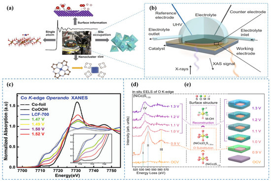(a) The applicable range of in situ XAS [4]. (b) Schematic of the in situ XAS configuration for electrocatalyst analysis [4]. (c) In situ XAS spectra at the Co K-edge XANES for LCF-700, measured within the potential range of 1.47 to 1.52 V (vs. RHE) in 0.1 M KOH [44]. (d) In situ EELS spectra of the O K-edge at varying applied potentials [45]. (e) Schematic representation of the sulfur-to-oxygen substitution within the crystal lattice [45].