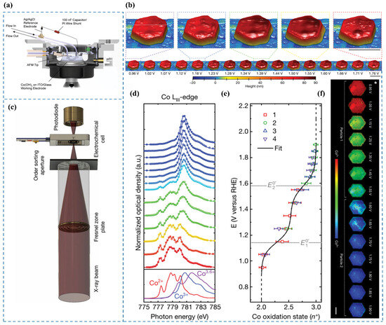 (a) Schematic of the operando EC-AFM cell [65]. (b) Surface morphology of a β-Co(OH)2 particle in 0.1 M KOH under varying applied potentials. Scale bars: 500 nm [65]. (c) Experimental configuration of the electrochemical flow cell integrated with the STXM microscope [65]. (d) Co LIII-edge STXM-XAS spectra averaged across particles as a function of applied potential [65]. (e) Correlation between applied potential and the oxidation state of Co [65]. (f) Phase maps illustrating the steady-state oxidation states of Co in β-Co(OH)2 particles 1 and 2 at different potentials. Scale bar: 1 μm [65].
