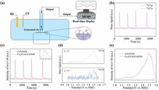 (a) Schematic illustration of the in situ 18O isotope-labeled DEMS setup for detecting evolved O2 [27]. (b) Time-dependent DEMS signals of 34O2 and 36O2 recorded for Cu2S/CoFeCuOOH [27]. (c) Comparative time-resolved 34O2 signals for CoFeOOH and Cu2S/CoFeCuOOH [27]. (d) Potential-dependent evolution profiles of 34O2 and 36O2 signals for Cu2S/CoFeCuOOH [27]. (e) 34O2 signal variations as a function of applied potential for both CoFeOOH and Cu2S/CoFeCuOOH [27].