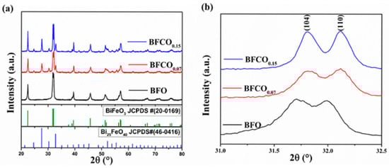 - Bai, L.; Sun, M.; Ma, W.; Yang, J.; Zhang, J.; Liu, Y. Enhanced Magnetic Properties of Co-Doped BiFeO3 Thin Films via Structural Progression. Nanomaterials 2020, 10, 1798. [Google Scholar] [CrossRef]