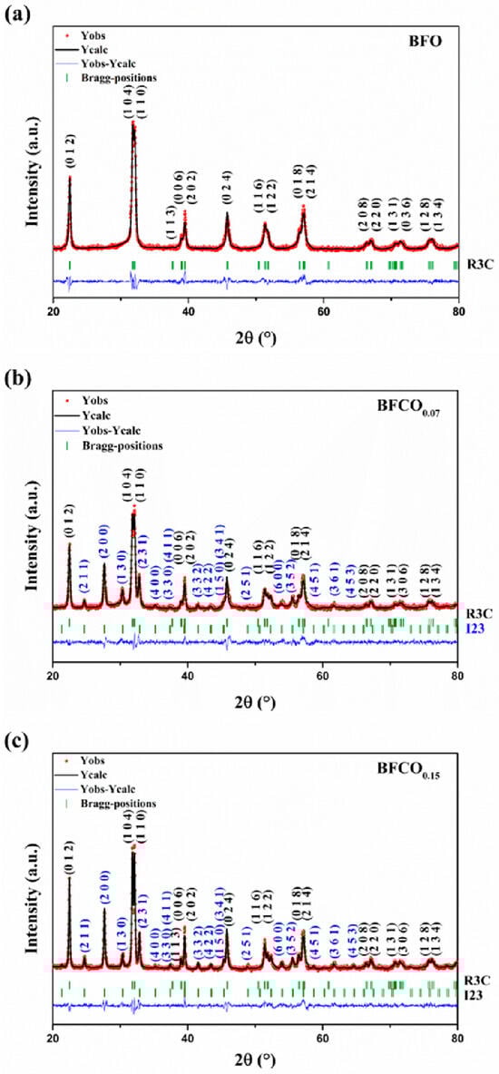 Rietveld refinement of the X-ray diffraction patterns of (a) BFO, (b) BFCO0.07, and (c) BFCO0.15 nanopowders.