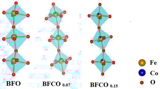 Further structural insights were derived from bond lengths and angles (Table 2). In BFCO0.07, the shortened Fe–O bond (1.994 Å vs. 2.013 Å in BFO) and near-linear Fe–O–Fe angle (166.09°) reflect reduced octahedral tilting and compressive strain within the dominant R3c phase. Coherent interfaces with the cubic I23 phase (27% fraction) further alleviate interfacial strain. In contrast, BFCO0.15 exhibits elongated Fe–O bonds (2.009 Å) and a distorted Fe–O–Fe angle (160.23°), indicative of tensile strain and enhanced octahedral tilting. While the overall lattice parameters indicate compressive strain in the perovskite phase due to lattice mismatch at the R3c/I23 heterointerface, local atomic distortions within the perovskite phase, particularly in BFCO0.15, show evidence of tensile strain. This local tensile strain, evidenced by elongated Fe–O bonds (2.009 Å) and distorted Fe–O–Fe angles (160.23°), arises from the incorporation of larger Co2+ ions (0.745 Å) and potential oxygen vacancies, which cause local lattice expansion despite the overall compressive trend []. A schematic presentation of bond lengths and angles in all samples using Vesta software is depicted in Figure 3.