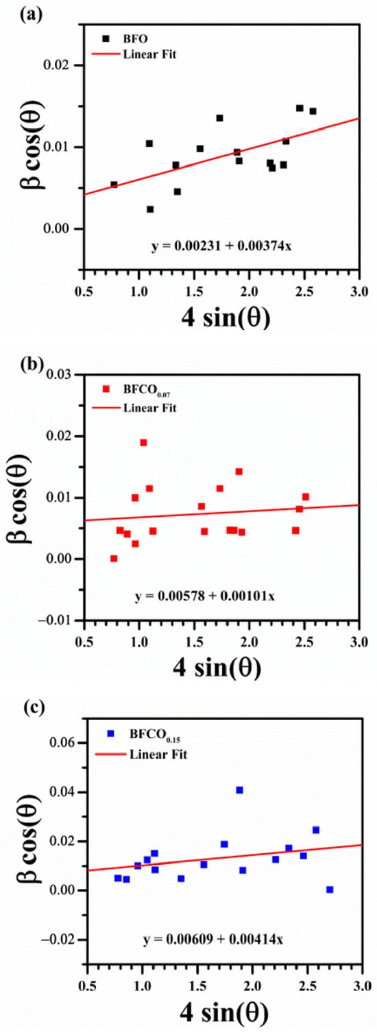 Williamson–Hall plots for (a) BFO, (b) BFCO0.07, and (c) BFCO0.15.