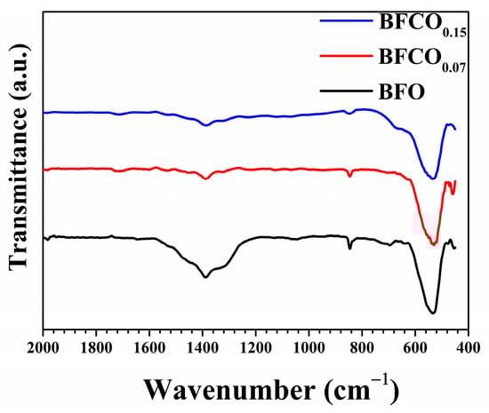 FTIR spectra of BFO, BFCO0.07, and BFCO0.15 nanopowders.